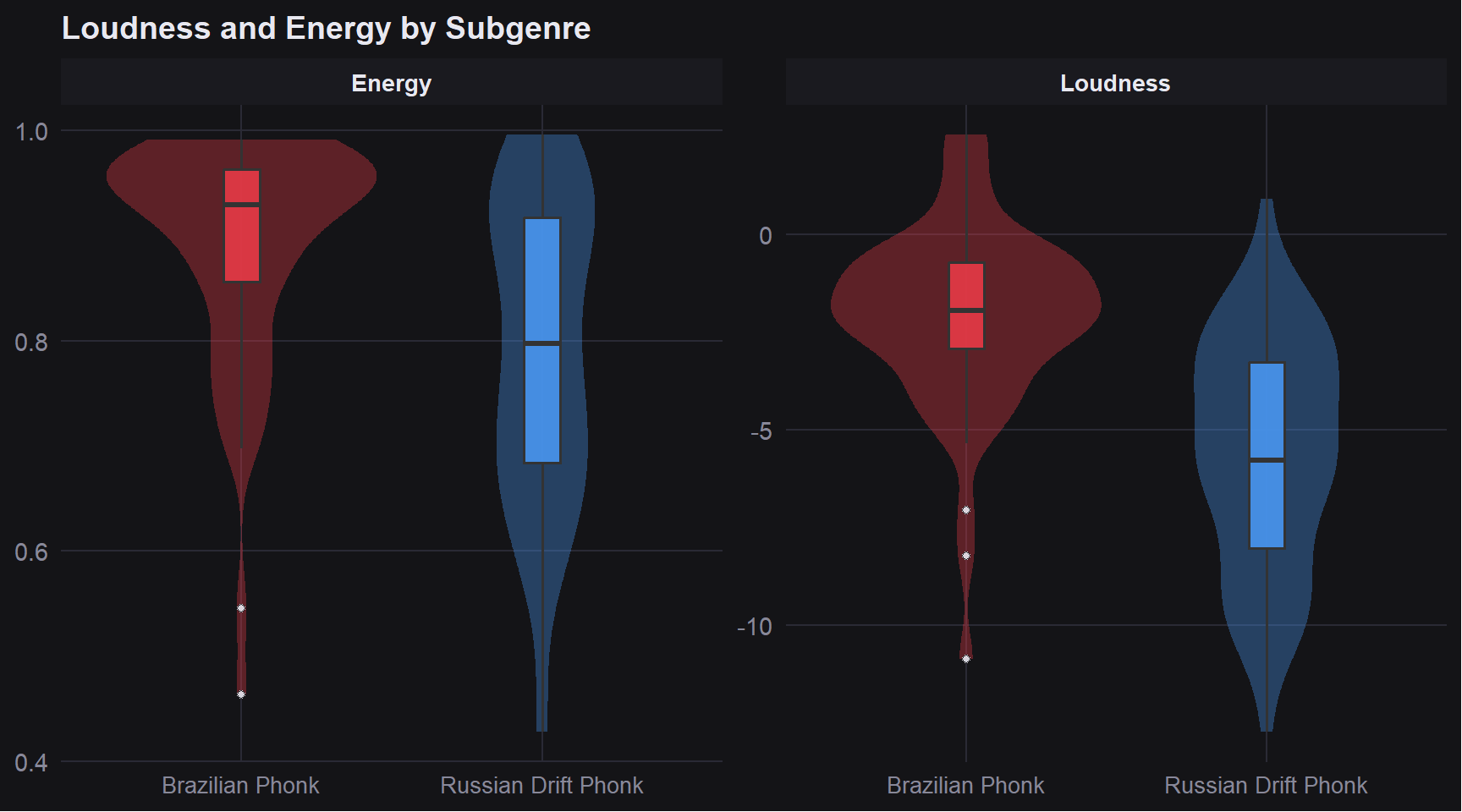 Brazilian Phonk tends to score higher on both. Tracks are heavily compressed and mastered to sound as loud and punchy as possible, because they are made for gym playlists and high-energy DJ sets where volume matters.