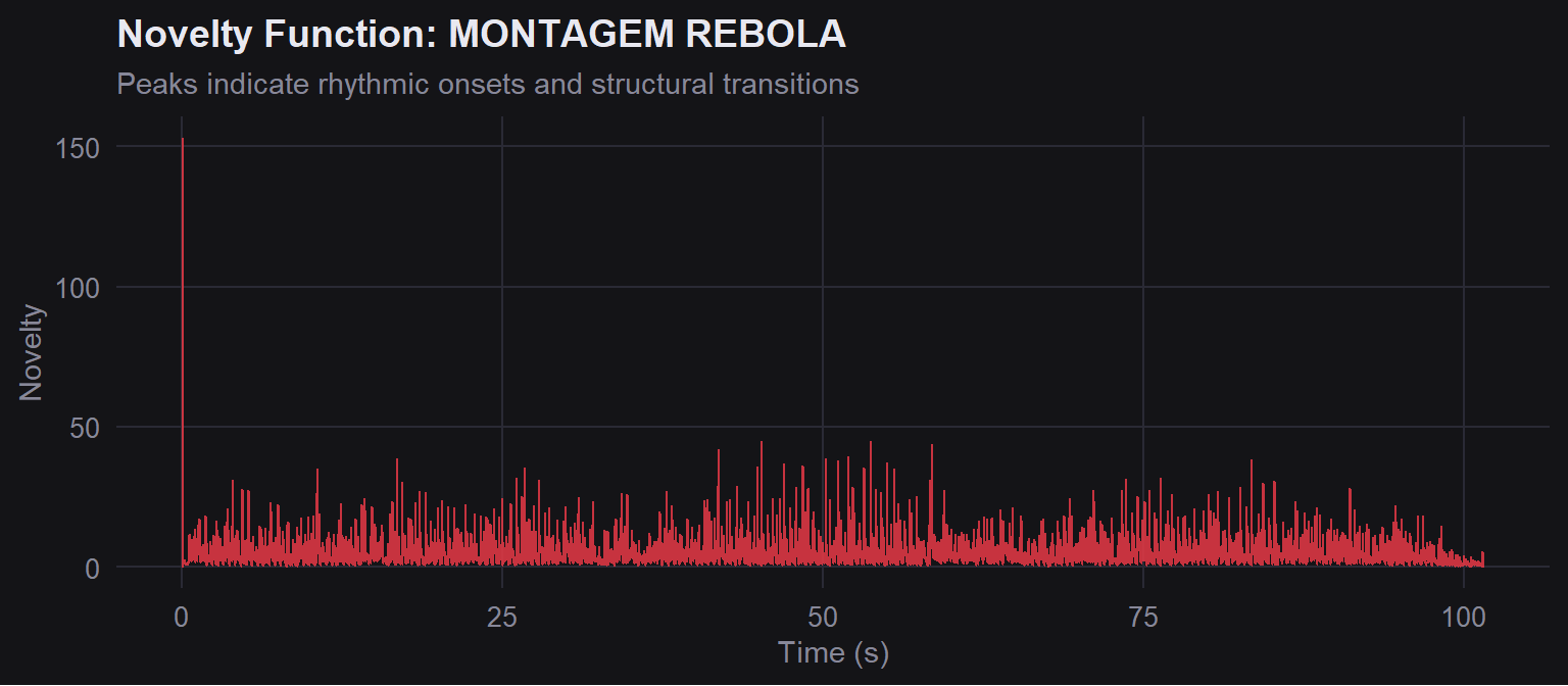 The novelty function for *MONTAGEM REBOLA* is expected to show **dense, evenly spaced peaks** throughout the track. This would confirm what the chromagram already suggested: the track is built on a relentlessly consistent rhythmic loop with no real quiet sections or structural breaks. Every beat hits with roughly the same force, which is exactly what Brazilian Phonk is designed to do.